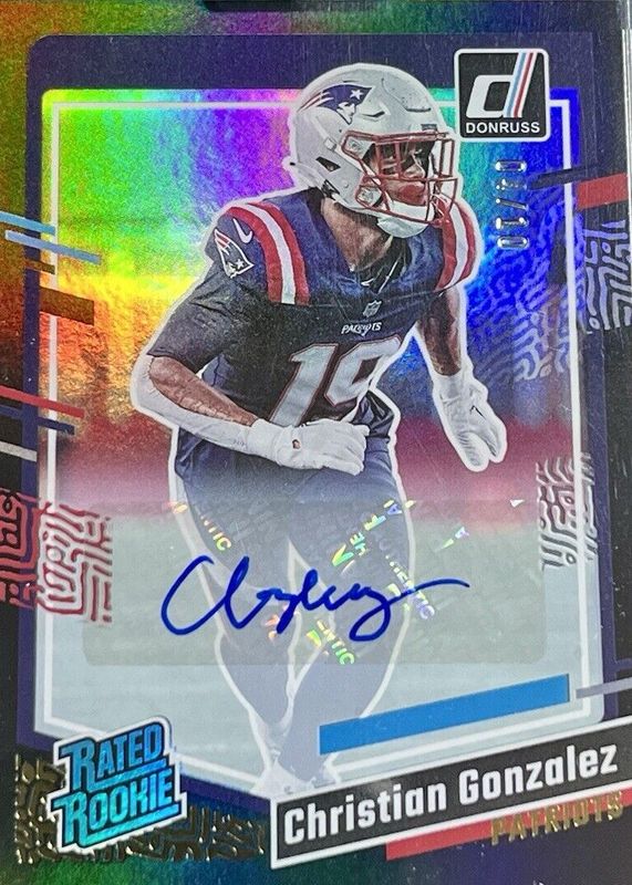 This card is 1 of 40 Christian Gonzalez's card variations in the 2023 Donruss set being tracked by Sports Card Investor, including Base, Aqueous Test, Canvas, Jersey Number (/19), and No Name.