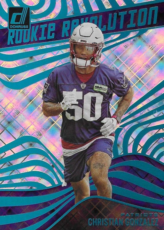 The Christian Gonzalez 2023 Donruss #RR-13 Rookie Revolution - Cosmic /100 card in Raw condition has not changed in price in the last 30 days and was last sold for $8.00 .