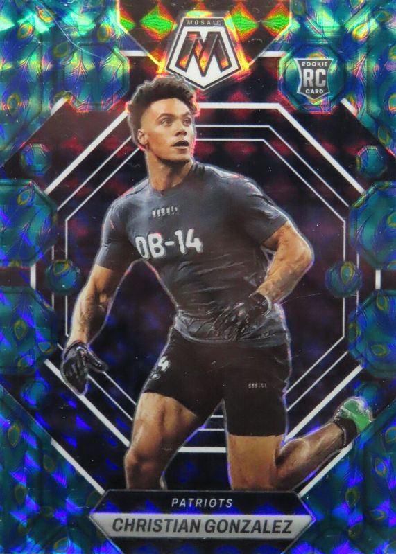The Christian Gonzalez 2023 Mosaic #300 Choice Peacock /(SSP) Rookie card in Raw condition has not changed in price in the last 30 days and was last sold for $6.50 .