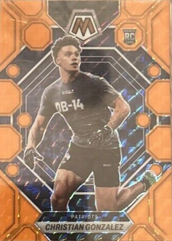 2023 Mosaic #300 Christian Gonzalez Orange Fluorescent Prizm Rookie /25 SSP Pats