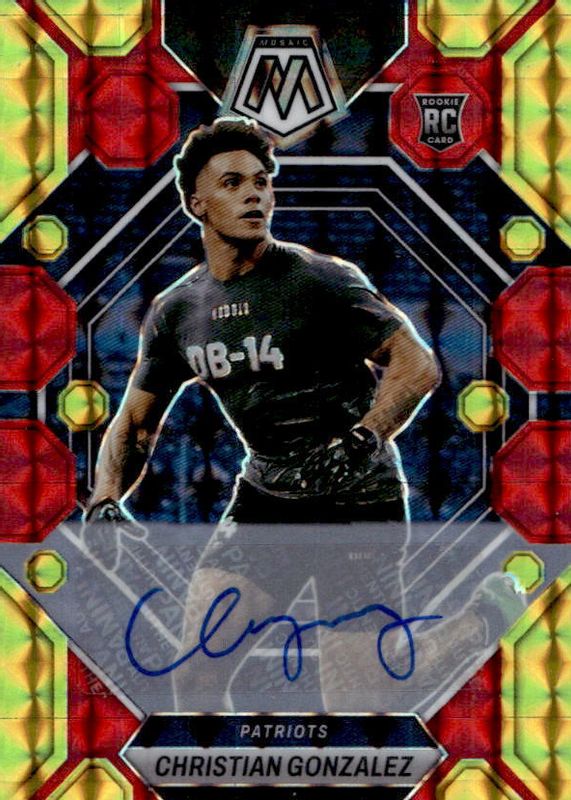 The Christian Gonzalez 2023 Mosaic #300 Rookie Autographs - Choice Fusion Red & Yellow card in Raw condition has not changed in price in the last 30 days and was last sold for $33.00 .