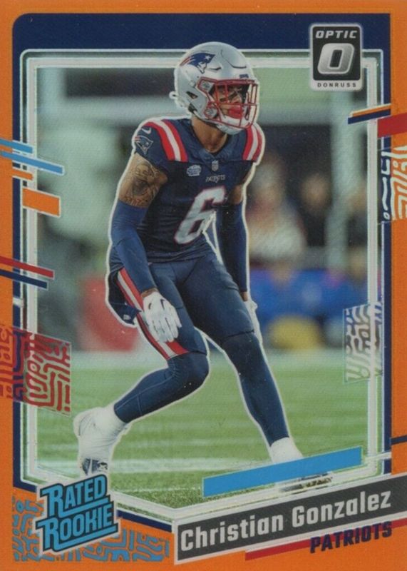2023 Donruss Optic #274 Christian Gonzalez Orange Holo #/249 Rookie RC Patriots