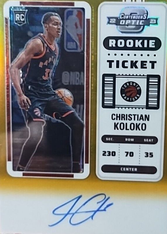 The Christian Koloko 2022 Contenders Optic #116 Rookie Ticket Auto - Gold /10 card in Raw condition has not changed in price in the last 30 days and was last sold for $41.00 .