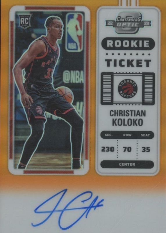 The Christian Koloko 2022 Contenders Optic #116 Rookie Ticket Auto - Orange /25 card in Raw condition has not changed in price in the last 30 days and was last sold for $5.50 .