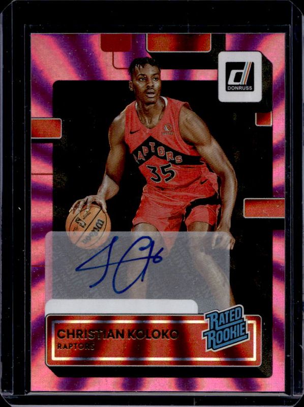 The Christian Koloko 2022 Donruss #233 Rated Rookie Signatures - Holo Pink Laser card is 1 of 44 Christian Koloko's card variations in the 2022 Donruss set being tracked by Sports Card Investor, including Base, Choice, Holo Green Laser, Holo Red & Gold Laser, and Press Proof Silver.