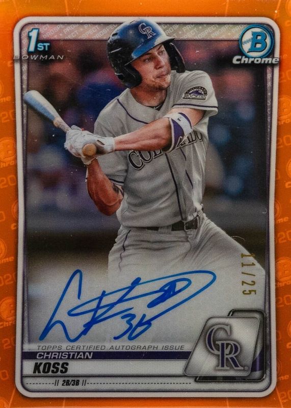 The Christian Koss 2020 Bowman Chrome #CPA-CK Prospect Auto - Orange Refractor /25 (1st) card in Raw condition has not changed in price in the last 30 days and was last sold for $47.51 .