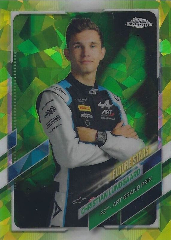This card is 1 of 11 Christian Lundgaard's card variations in the 2021 Topps Chrome Formula 1 Sapphire Edition set being tracked by Sports Card Investor, including Base, Negative /100, Aqua /99, Green /75, and Gold /50.