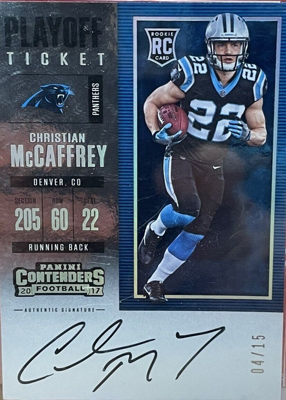 The Christian McCaffrey 2017 Contenders #311 Rookie Ticket Auto - Playoff Ticket (/15) card in Raw condition has not changed in price in the last 30 days and was last sold for $350.00 .