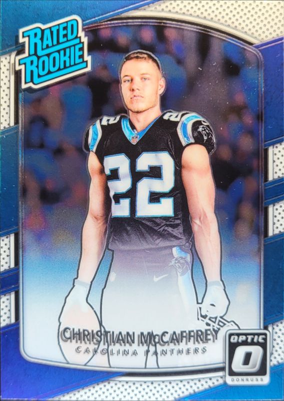 The Christian McCaffrey 2017 Optic #168 Rated Rookies Autographs /150 card is 1 of 65 Christian McCaffrey's card variations in the 2017 Optic set being tracked by Sports Card Investor, including Base, Bronze, Holo, Lime, and Pink.