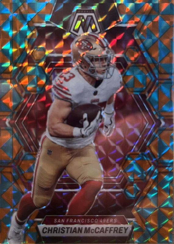 This card is 1 of 26 Christian McCaffrey's card variations in the 2023 Mosaic set being tracked by Sports Card Investor, including Choice Peacock /(SSP), Genesis /(SSP), Honeycomb /(SSP), No Huddle Purple /50, and Red Sparkle /(SSP).