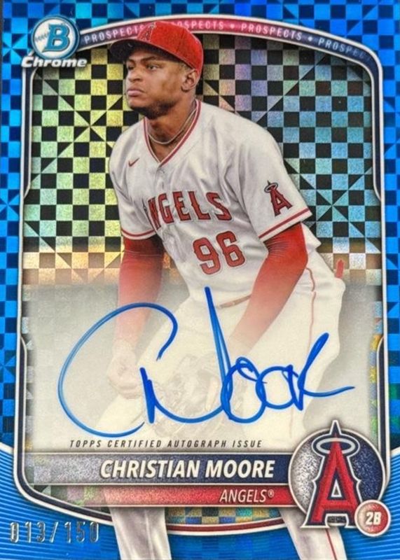 Auctions Ending Soon for Christian Moore 2025 Bowman #CPA-CMO Chrome Prospect Auto - Blue X-Fractor /150 RAW