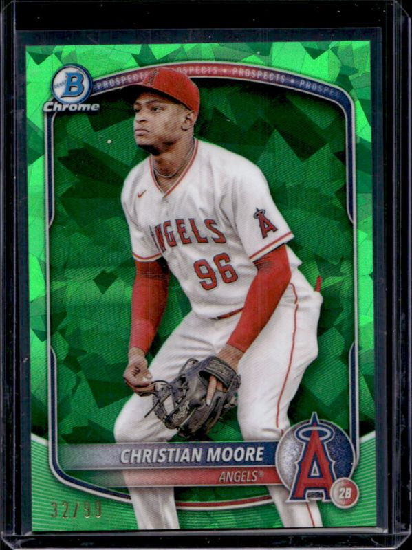The Christian Moore 2025 Bowman Sapphire Edition #BCP-107 Chrome Prospects - Green Refractor /99 card is 1 of 25 Christian Moore's card variations in the 2025 Bowman Sapphire Edition set being tracked by Sports Card Investor, including Chrome Prospects, Sapphire Selections, Sapphire Selections Autographs, Chrome Prospect Autographs /199, and Chrome Prospect Autographs - Green Refractor /99.