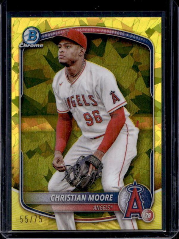 The Christian Moore 2025 Bowman Sapphire Edition #BCP-107 Chrome Prospects - Yellow Refractor /75 card is 1 of 25 Christian Moore's card variations in the 2025 Bowman Sapphire Edition set being tracked by Sports Card Investor, including Chrome Prospects, Sapphire Selections, Sapphire Selections Autographs, Chrome Prospect Autographs /199, and Chrome Prospect Autographs - Green Refractor /99.
