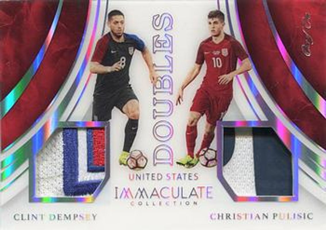 The Christian Pulisic / Clint Dempsey 2017 Immaculate #TD-US1 Team Doubles - Platinum /1 card is 1 of 4 Christian Pulisic / Clint Dempsey's card variations in the 2017 Immaculate set being tracked by Sports Card Investor, including Team Doubles /75, Team Doubles - Bronze /25, and Team Doubles - Gold /10.