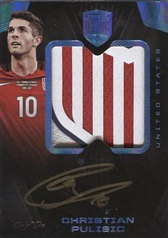 The Christian Pulisic 2018 Eminence #JP-CP Jumbo Patch Autographs Platinum /1 card is 1 of 57 Christian Pulisic's card variations in the 2018 Eminence set being tracked by Sports Card Investor, including Autographs /10, Banner Signatures /10, Crown Jewels /10, Etched in History /10, and Grand Signatures /10.