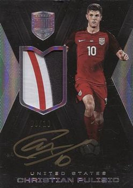 The Christian Pulisic 2018 Eminence #P-CP Patch Autographs /10 card is 1 of 57 Christian Pulisic's card variations in the 2018 Eminence set being tracked by Sports Card Investor, including Autographs /10, Banner Signatures /10, Crown Jewels /10, Etched in History /10, and Grand Signatures /10.