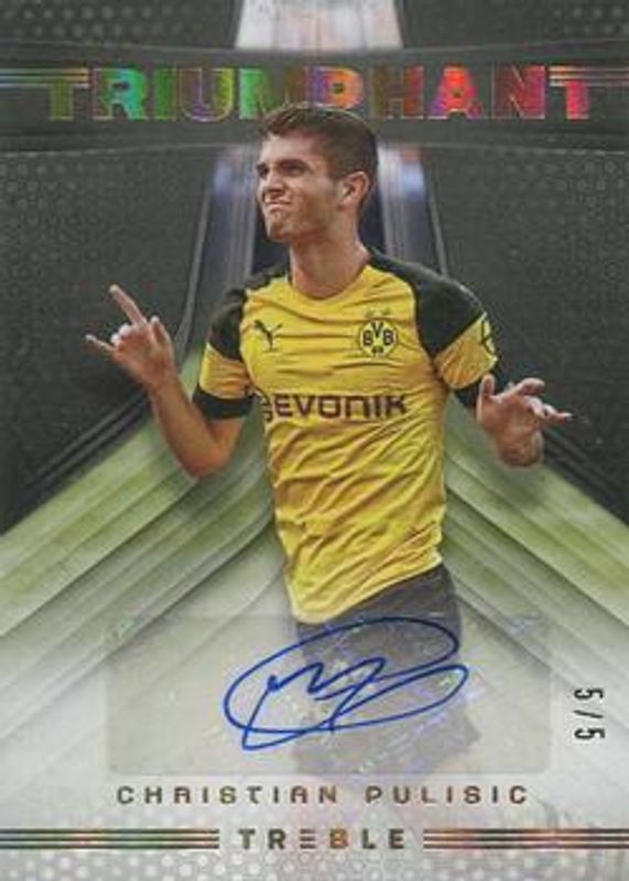 The Christian Pulisic 2018 Treble #T-CP Triumphant Autographs Gold /5 card is 1 of 21 Christian Pulisic's card variations in the 2018 Treble set being tracked by Sports Card Investor, including Base, Blue /75, Purple /49, Gold /25, and Green /10.