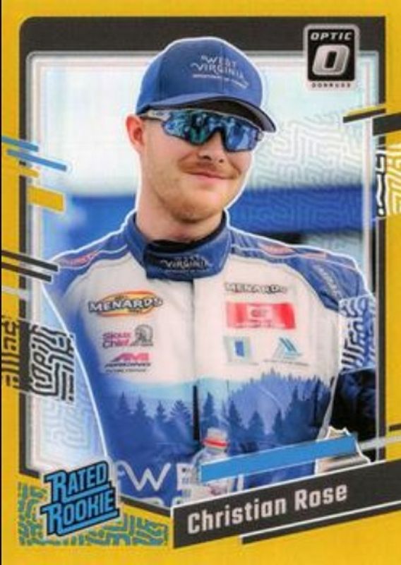 The Christian Rose 2024 Donruss NASCAR #99 Optic Gold /10 Rookie card is 1 of 39 Christian Rose's card variations in the 2024 Donruss NASCAR set being tracked by Sports Card Investor, including Base, Optic, Optic Black Pandora, Optic Blue Velocity, and Optic Holo.