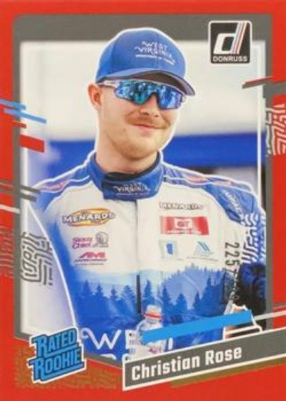 The Christian Rose 2024 Donruss NASCAR #99 Red /299 Rookie card is 1 of 39 Christian Rose's card variations in the 2024 Donruss NASCAR set being tracked by Sports Card Investor, including Base, Optic, Optic Black Pandora, Optic Blue Velocity, and Optic Holo.