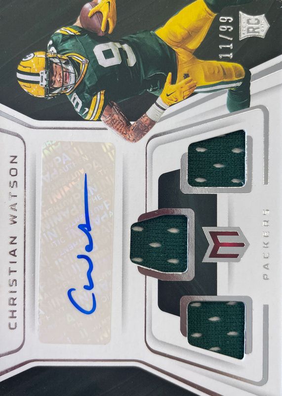 The Christian Watson 2022 Chronicles #MJA-CHW Momentum Triple Jersey Autographs (/99) Rookie card in Raw condition has not changed in price in the last 30 days and was last sold for $22.50 .