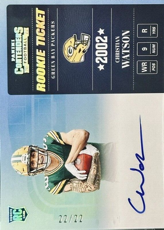 Best Prices Available For Sale of Christian Watson 2022 Contenders #02RT-CWA 2002 Rookie Ticket Auto /22