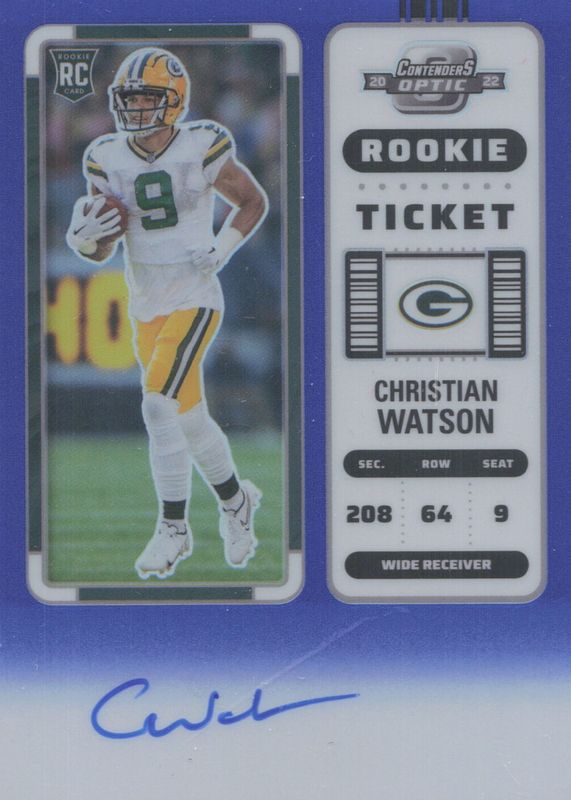 The Christian Watson 2022 Contenders Optic #110 Rookie Ticket Auto - Blue /75 card in Raw condition has not changed in price in the last 30 days and was last sold for $24.50 .