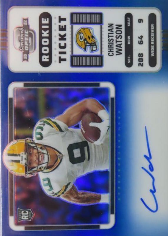 2022 Contenders Optic Christian Watson Variation Blue Jersey # 9/25 Auto Packers