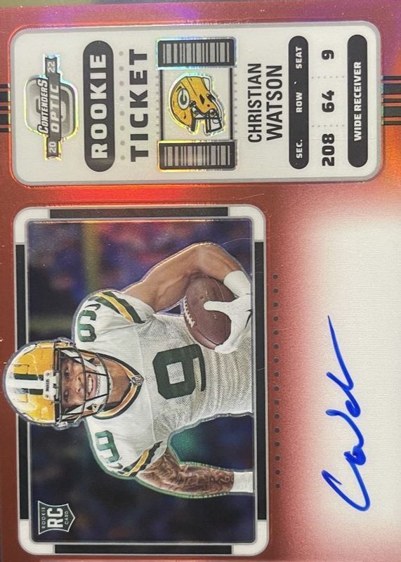Best Prices Available For Sale of Christian Watson 2022 Contenders Optic #110 Rookie Ticket Auto Variation - Red /50