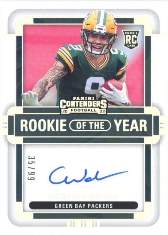 The Christian Watson 2022 Contenders #RYA-CWA Rookie of the Year Contenders Autographs (/99) card in Raw condition has not changed in price in the last 30 days and was last sold for $13.50 .