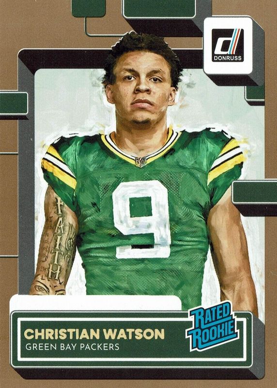 This card is 1 of 38 Christian Watson's card variations in the 2022 Donruss set being tracked by Sports Card Investor, including Base, Aqueous Test, Canvas, Jersey Number (/9), and No Name.