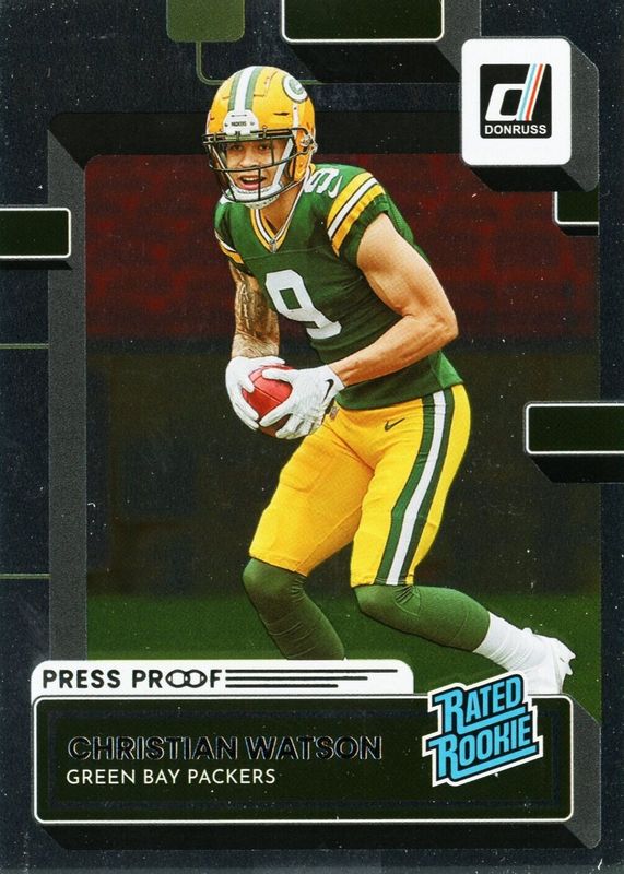 The Christian Watson 2022 Donruss #319 Press Proof Silver /100 Rookie card in Raw condition has not changed in price in the last 30 days and was last sold for $9.50 .