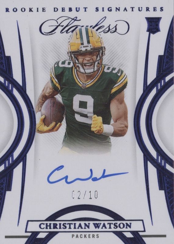 The Christian Watson 2022 Flawless #RDS-CW Rookie Debut Signatures - Sapphire (/10) card in Raw condition has not changed in price in the last 30 days and was last sold for $132.50 .