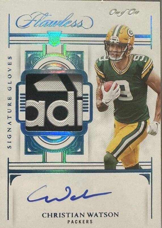 The Christian Watson 2022 Flawless #SG-CW Signature Gloves - Platinum /1 Rookie card in Raw condition has not changed in price in the last 30 days and was last sold for $750.00 .