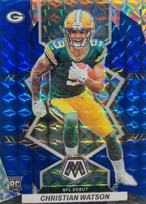 The Christian Watson 2022 Mosaic #281 NFL Debut - Blue /99 Rookie card in Raw condition has moved up $4.75 (+146%) in the last 30 days and was last sold for $8.00 .