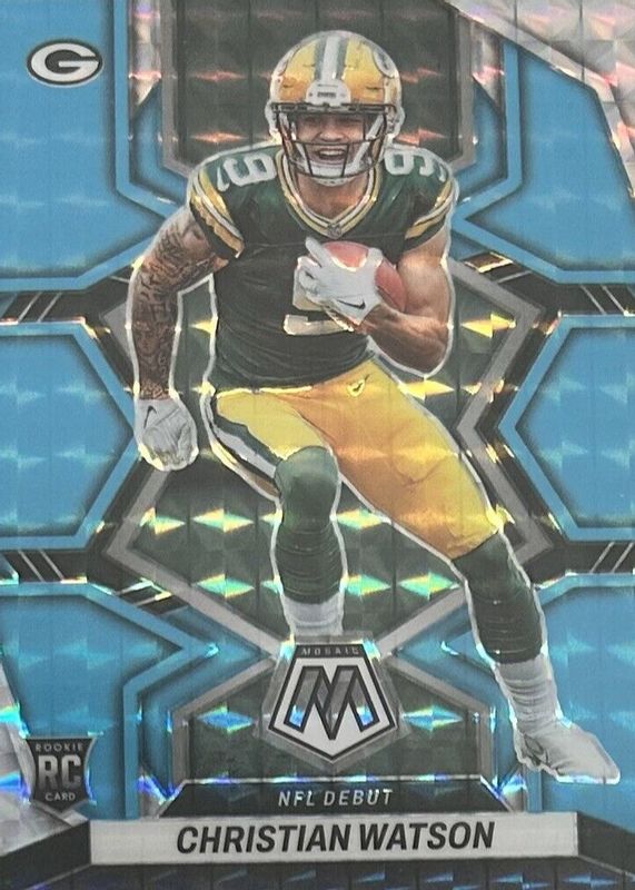 Auctions Ending Soon for Christian Watson 2022 Mosaic #281 NFL Debut - Blue Fluorescent /15 Rookie RAW