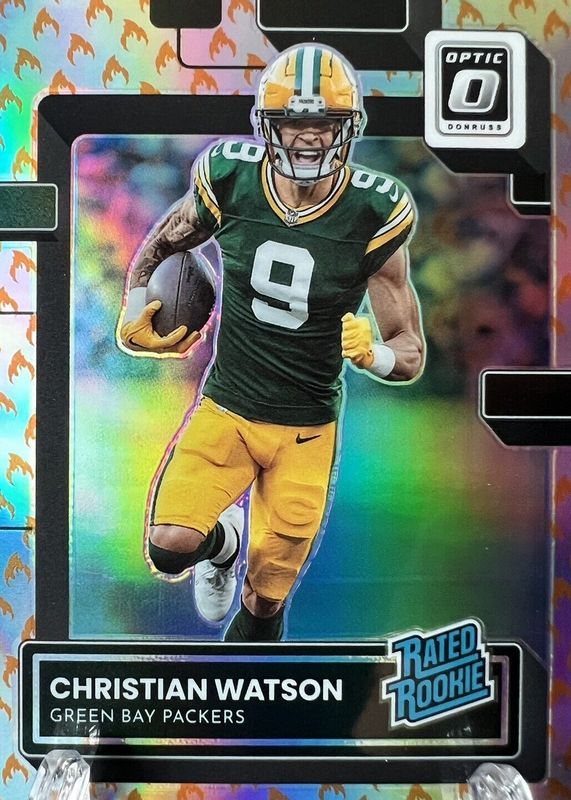 2022 Donruss Optic CHRISTIAN WATSON Rated Rookie Fire Emoji SSP RC #219 Packers