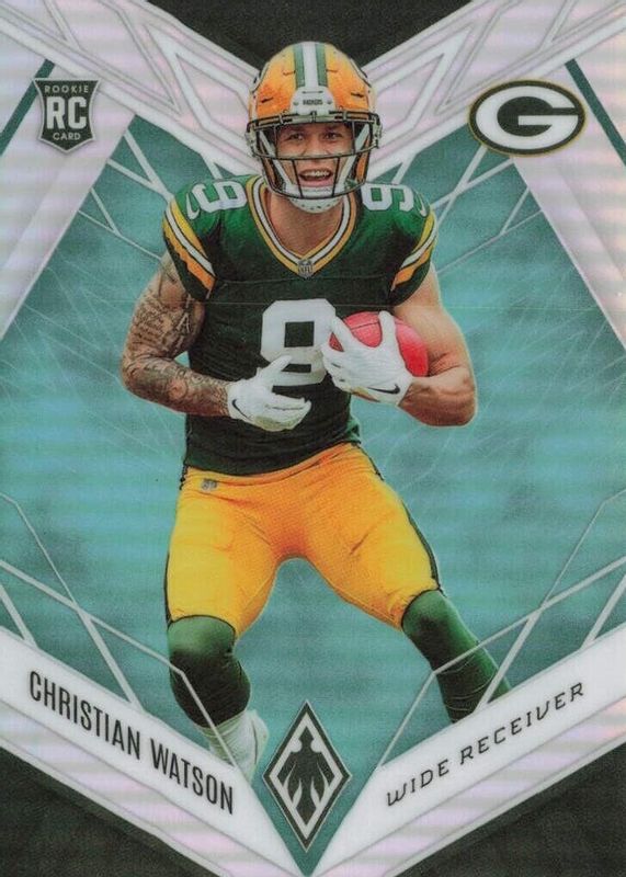 This card is 1 of 28 Christian Watson's card variations in the 2022 Phoenix set being tracked by Sports Card Investor, including Base, Color Burst, Onyx (/5), Red Mojo (/10), and Silver.