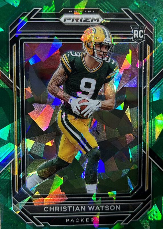 This card is 1 of 71 Christian Watson's card variations in the 2022 Prizm set being tracked by Sports Card Investor, including Base, Green, Light Blue, No Huddle, and Orange Ice.