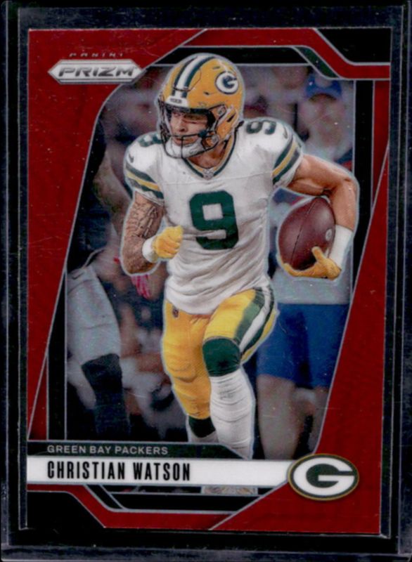 The Christian Watson 2024 Prizm #103 Red /(SSP) card is 1 of 83 Christian Watson's card variations in the 2024 Prizm set being tracked by Sports Card Investor, including Base, Choice Blue Yellow Green, Choice Silver, Disco, and Green.
