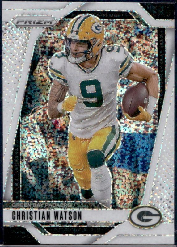The Christian Watson 2024 Prizm #103 White Sparkle /(SSP) card is 1 of 83 Christian Watson's card variations in the 2024 Prizm set being tracked by Sports Card Investor, including Base, Choice Blue Yellow Green, Choice Silver, Disco, and Green.