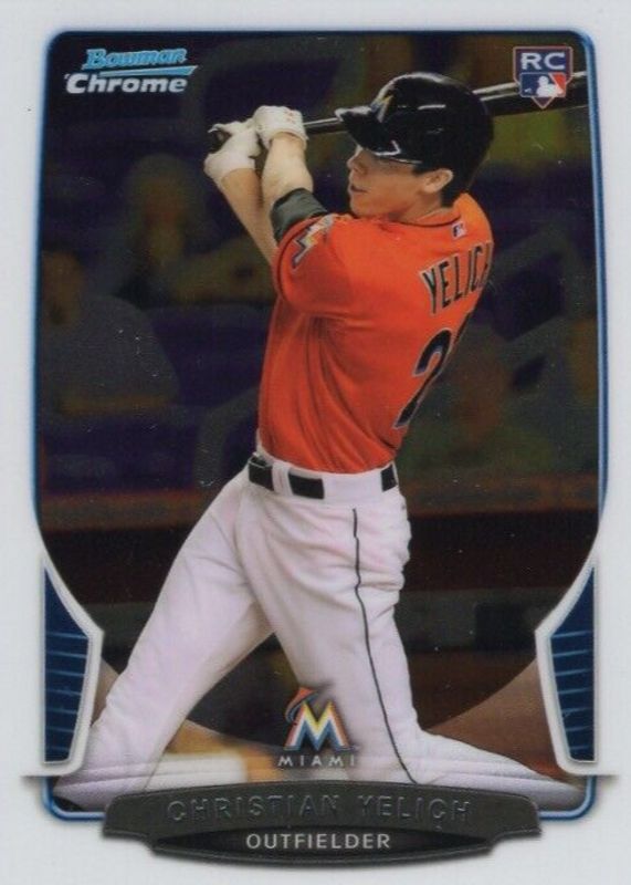 The Christian Yelich 2013 Bowman Draft #40 Chrome Rookie card in Raw condition has moved down -$0.24 (-10.8%) in the last 30 days and was last sold for $2.01 .