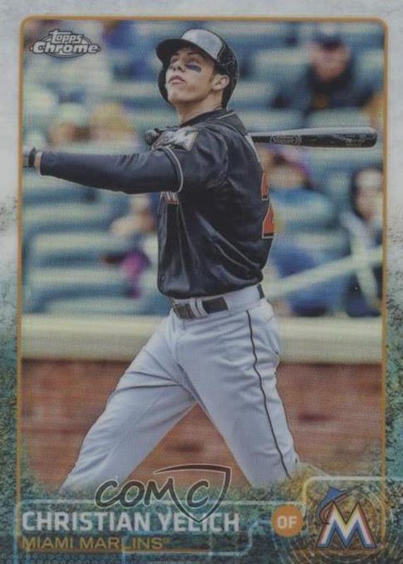 This card is 1 of 11 Christian Yelich's card variations in the 2015 Topps Chrome set being tracked by Sports Card Investor, including Pink Refractor, Prism Refractor, Sepia Refractor, Purple Refractor /250, and Blue Refractor /150.