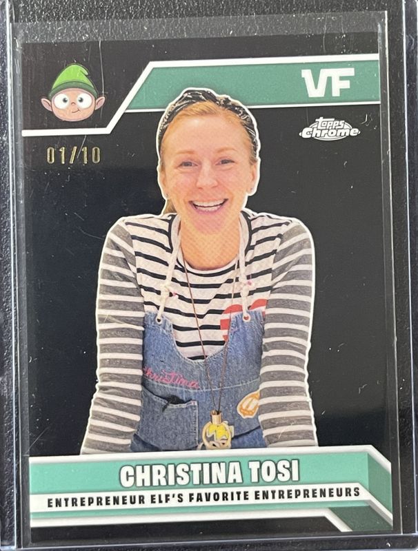 The Christina Tosi 2025 Topps Chrome VeeFriends #EE-CT Entrepreneur Elf’s Favorite Entrepreneurs - Black Refractor /10 card is 1 of 10 Christina Tosi's card variations in the 2025 Topps Chrome VeeFriends set being tracked by Sports Card Investor, including Entrepreneur Elf’s Favorite Entrepreneurs - Gold Refractor /50, Entrepreneur Elf’s Favorite Entrepreneurs - Orange Refractor /25, Entrepreneur Elf’s Favorite Entrepreneurs - VeeFriends Green Refractor /99, Entrepreneur Elf’s Favorite Entrepreneurs, and Entrepreneur Elf’s Favorite Entrepreneurs Autographs.