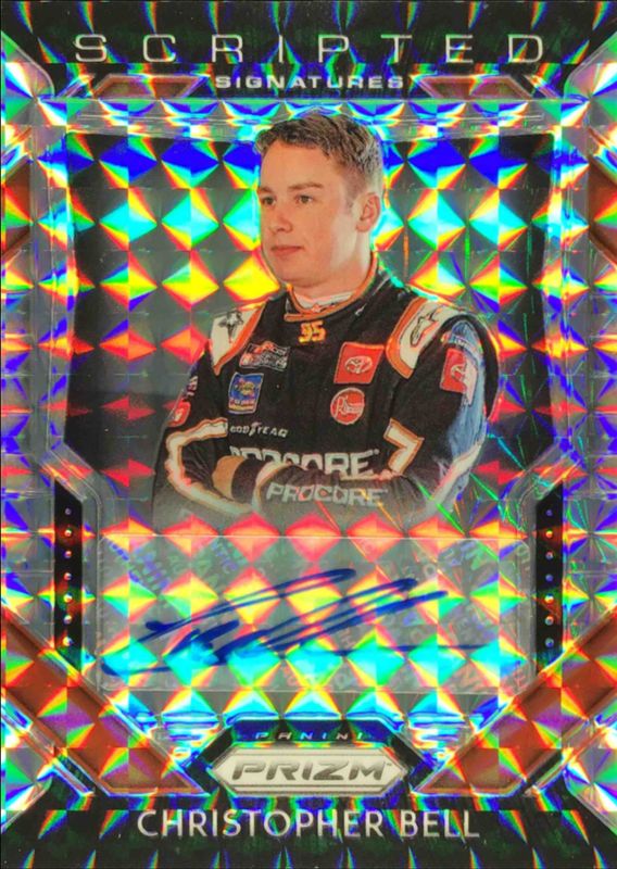 The Christopher Bell 2020 Prizm NASCAR #SS-CB Scripted Signatures - Silver Mosaic /99 card is 1 of 47 Christopher Bell's card variations in the 2020 Prizm NASCAR set being tracked by Sports Card Investor, including Base, Blue, Blue & Carolina Blue Hyper, Green & Yellow Hyper, and Red.