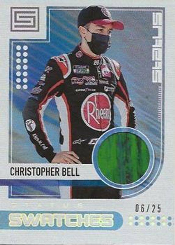 The Christopher Bell 2021 Chronicles NASCAR #SS-CB Status Swatches - Holo Silver /25 card is 1 of 42 Christopher Bell's card variations in the 2021 Chronicles NASCAR set being tracked by Sports Card Investor, including Absolute, Absolute Autographs, Cornerstones Materials Signatures, Obsidian, and Score.