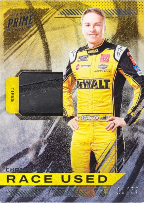 The Christopher Bell 2023 Panini Prime #RU-CBE Race Used Tires /99 card is 1 of 16 Christopher Bell's card variations in the 2023 Panini Prime set being tracked by Sports Card Investor, including Base /49, Holo Gold /25, Holo Silver /10, Purple /5, and Holo Platinum Blue /1.