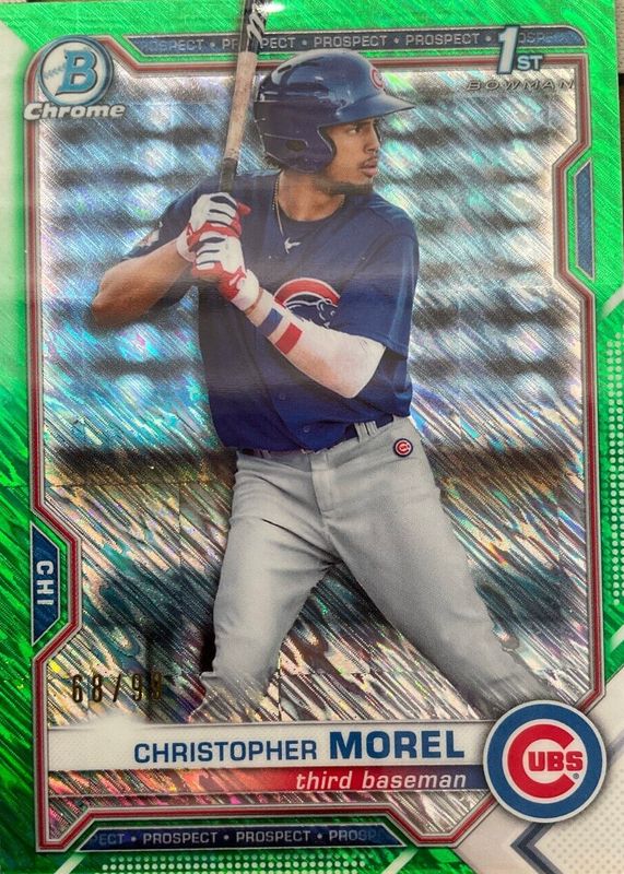 The Christopher Morel 2021 Bowman #BCP-131 Chrome Prospects - Green Shimmer Refractor /99 (1st) card in Raw condition has not changed in price in the last 30 days and was last sold for $13.50 .