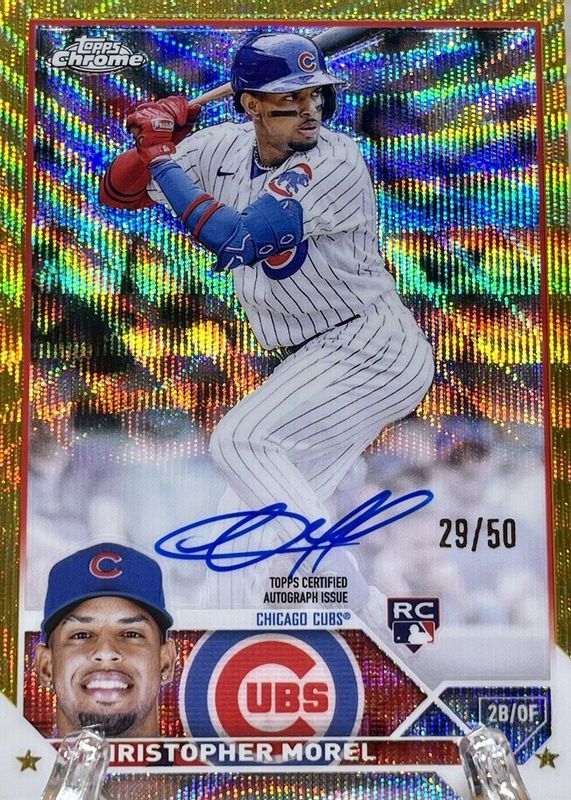 The Christopher Morel 2023 Topps Chrome #RA-CMO Rookie Autographs - Gold Wave Refractor /50 card in Raw condition has not changed in price in the last 30 days and was last sold for $23.50 .