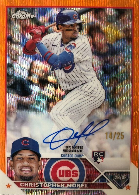 2023 TOPPS CHROME CHRISTOPHER MOREL RC ORANGE WAVE REFRACTOR AUTO 14/25 CUBS
