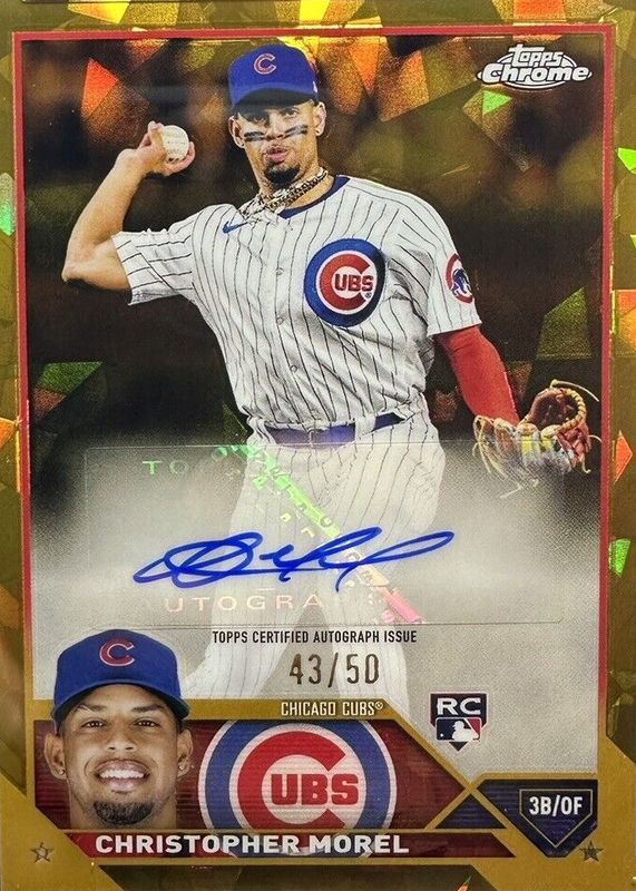 The Christopher Morel 2023 Topps Chrome Update Sapphire Edition #USA-CM Autographs - Gold /50 Rookie card in Raw condition has not changed in price in the last 30 days and was last sold for $28.55 .